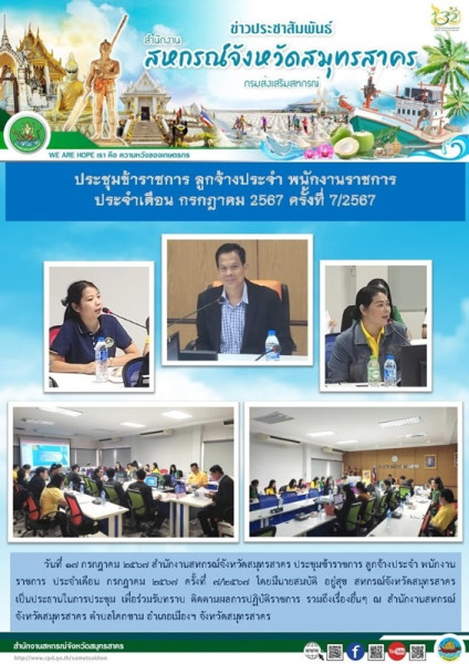 เมื่อวันที่ 17 กรกฎาคม 2567 สำนักงานสหกรณ์จังหวัดสมุทรสาคร ประชุมข้าราชการ ลูกจ้างประจำ พนักงานราชการ ประจำเดือน กรกฎาคม 2567 ครั้งที่ 7/2567 โดยมีนายสมบัติ อยู่สุข สหกรณ์จังหวัดสมุทรสาคร เป็นประธานในการประชุม เพื่อร่วมรับทราบ ติดตามผลการปฏิบัติราชการ รวมถึงเรื่องอื่นๆ ณ สำนักงานสหกรณ์จังหวัดสมุทรสาคร ตำบลโคกขาม อำเภอเมืองฯ จังหวัดสมุทรสาคร