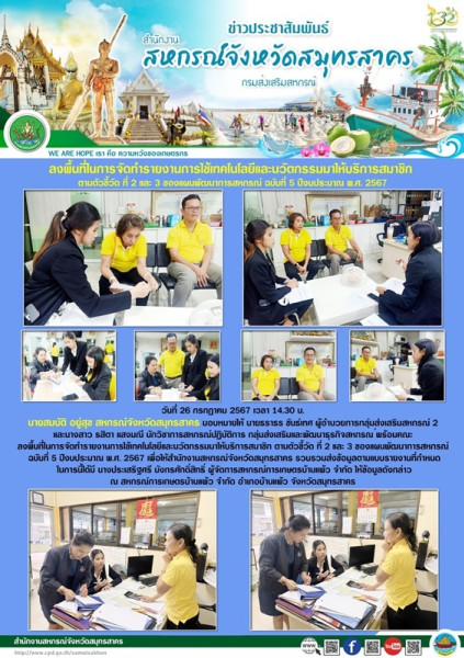 เมื่อวันที่ 26 กรกฎาคม 2567 เวลา 14.30 น. นายสมบัติ อยู่สุข สหกรณ์จังหวัดสมุทรสาคร มอบหมายให้ นายธราธร ขันธ์เทศ ผู้อำนวยการกลุ่มส่งเสริมสหกรณ์ 2 และนางสาว รสิตา แสงมณี นักวิชาการสหกรณ์ปฏิบัติการ กลุ่มส่งเสริมและพัฒนาธุรกิจสหกรณ ์พร้อมคณะลงพื้นที่ในการจัดทำรายงานการใช้เทคโนโลยีและนวัตกรรมมาให้บริการสมาชิก ตามตัวชี้วัด ที่ 2 และ 3 ของแผนพัฒนาการสหกรณ์ ฉบับที่ 5 ปีงบประมาณ พ.ศ. 2567 เพื่อให้สำนักงานสหกรณ์จังหวัดสมุทรสาคร รวบรวมส่งข้อมูลตามแบบรายงานที่กำหนด ในการนี้ได้มี นางประเสริฐศรี มังกรศักดิ์สิทธิ์ ผู้จัดการสหกรณ์การเกษตรบ้านแพ้ว จำกัด ให้ข้อมูลดังกล่าว