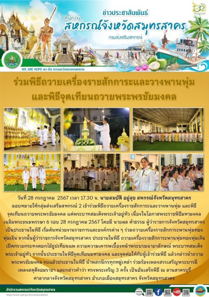 เมื่อวันที่ 28 กรกฎาคม 2567 เวลา 17.30 น. นายสมบัติ อยู่สุข สหกรณ์จังหวัดสมุทรสาคร มอบหมายให้กลุ่มส่งเสริมสหกรณ์ 2 เข้าร่วมพิธีถวายเครื่องราชสักการะและวางพานพุ่ม และพิธี