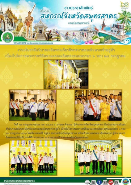 วันที่ 29 กรกฎาคม 2567 เวลา 18.30 น. นายผล ดำธรรม ผู้ว่าราชการจังหวัดสมุทรสาครเป็นประธานงานสโมสรสันนิบาตเฉลิมพระเกียรติพระบาทสมเด็จพระเจ้าอยู่หัวเนื่องในโอกาสพระราชพิธีมหามงคลเฉลิมพระชนมพรรษา 6 รอบ 28 กรกฎาคม 2567 โดยมีนายสมบัติ อยู่สุข สหกรณ์จังหวัดสมุทรสาคร พร้อมด้วยนายพรเทพ เสียงไพเราะ ผู้อำนวยการนิคมสหกรณ์บ้านไร่ ร่วมพิธีถวายพระพร ณ ลานสาครบุรี ศาลากลางจังหวัดสมุทรสาคร