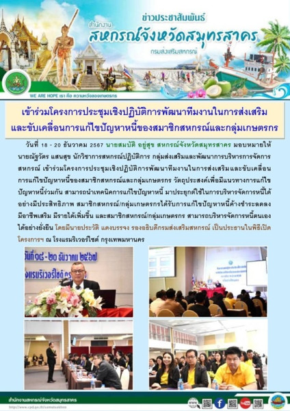 เมื่อวันที่ 18 - 20 ธันวาคม 2567 นายสมบัติ อยู่สุข สหกรณ์จังหวัดสมุทรสาคร มอบหมายให้ นายณัฐวัตร แสนสุข นักวิชาการสหกรณ์ปฏิบัติการ กลุ่มส่งเสริมและพัฒนาการบริหารการจัดการสหกรณ์ เข้าร่วมโครงการประชุมเชิงปฏิบัติการพัฒนาทีมงานในการส่งเสริมและขับเคลื่อนการแก้ไขปัญหาหนี้ของสมาชิกสหกรณ์และกลุ่มเกษตรกร วัตถุประสงค์เพื่อมีแนวทางการแก้ไขปัญหาหนี้ร่วมกัน สามารถนำเทคนิคการแก้ไขปัญหาหนี้ มาประยุกต์ใช้ในการบริหารจัดการหนี้ได้อย่างมีประสิทธิภาพ สมาชิกสหกรณ์/กลุ่มเกษตรกรได้รับการแก้ไขปัญหาหนี้ค้างชำระลดลง มีอาชีพเสริม มีรายได้เพิ่มขึ้น และสมาชิกสหกรณ์/กลุ่มเกษตรกร สามารถบริหารจัดการหนี้ตนเองได้อย่างยั่งยืน โดยมีนายประวัติ แดงบรรจง รองอธิบดีกรมส่งเสริมสหกรณ์ เป็นประธานในพิธีเปิดโครงการฯ ณ โรงแรมริเวอร์ไซต์ กรุงเทพมหานคร