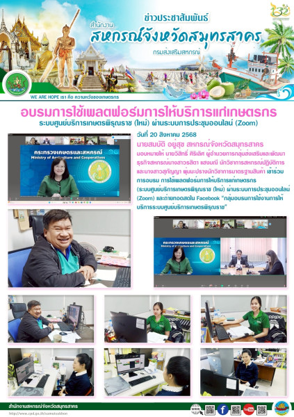 เมื่อวันที่ 20 สิงหาคม 2568 นายสมบัติ อยู่สุข สหกรณ์จังหวัดสมุทรสาคร มอบหมายให้ นายวิสิทธิ์ ศิริเลิศ ผู้อำนวยการกลุ่มส่งเสริมและพัฒนาธุรกิจสหกรณ์นางสาวรสิตา แสงมณี นักวิชาการสหกรณ์ปฏิบัติการ และนางสาวสุกัญญา พุ่มมะปรางนักวิชาการมาตรฐานสินค้า เข้าร่วมการอบรม การใช้เพลตฟอร์มการให้บริการแก่เกษตรกร (ระบบศูนย์บริการเกษตรพิรุณราช (ใหม่) ผ่านระบบการประชุมออนไลน์ (Zoom) และถ่ายทอดสดใน Facebook “กลุ่มอบรมการใช้งานการให้บริการระบบศูนย์บริการเกษตรพิรุณราช”