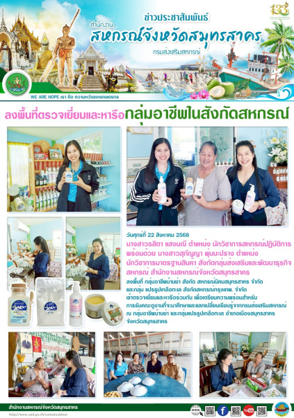 เมื่อวันศุกร์ที่ 22 สิงหาคม 2568 นางสาวรสิตา แสงมณี ตำแหน่ง นักวิชาการสหกรณ์ปฏิบัติการ พร้อมด้วย นางสาวสุกัญญา พุ่มมะปราง ตำแหน่ง นักวิชาการมาตรฐานสินค้า สังกัดกลุ่มส่งเสริมและพัฒนาธุรกิจสหกรณ์ สำนักงานสหกรณ์จังหวัดสมุทรสาคร ลงพื้นที่ กลุ่มอาชีพบ้านย่า สังกัด สหกรณ์นิคมสมุทรสาคร จำกัด และกลุ่ม แปรรูปเกลือทะเล สังกัดสหกรณ์กรุงเทพ. จำกัด เข้าตรวจเยี่ยมและหารือร่วมกัน เพื่อเตรียมความพร้อมสำหรับการรับคณะดูงานที่จะมาศึกษาและแลกเปลี่ยนเรียนรู้จากกรมส่งเสริมสหกรณ์ ณ กลุ่มอาชีพบ้านย่า และกลุ่มแปรรูปเกลือทะเล อำเภอเมืองสมุทรสาคร จังหวัดสมุทรสาคร