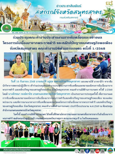 วันที่ 16 กันยายน 2568 นายสมบัติ อยู่สุข สหกรณ์จังหวัดสมุทรสาคร มอบหมายให้ นางจามีร่า ชาจาฮัน นักวิชาการสหกรณ์ปฏิบัติการ เข้าร่วมประชุมคณะทำงานประสานงานการขับเคลื่อนและขยายผลโครงการอันเนื่องมาจากพระราชดำริ และหลักปรัชญาของเศรษฐกิจพอเพียง จังหวัดสมุทรสาคร คณะทำงานมิติด้านการเกษตร ครั้งที่ 1/2568 โดยมี นางลักขณา พงษ์พานิช เกษตรและสหกรณ์จังหวัดสมุทรสาคร เป็นประธานการประชุมครั้งนี้ เพื่อรายงานผลการขับเคลื่อนและขยายผลโครงการอันเนื่องมาจากพระราชดำริและหลักปรัชญาของเศรษฐกิจพอเพียง ของแต่ละหน่วยงาน และพิจารณาแนวทางการขับเคลื่อนและขยายผลโครงการอันเนื่องมาจากพระราชดำริ และหลักปรัชญา ของเศรษฐกิจพอเพียง จังหวัดสมุทรสาคร คณะทำงานมิติด้านการเกษตร ประจำปีงบประมาณ พ.ศ.2569 ณ ห้องประชุมสำนักงานเกษตรและสหกรณ์จังหวัดสมุทรสาคร ในครั้งนี้ คณะทำงานมิติด้านการเกษตร ได้ลงพื้นที่ติดตามโครงการขยายผลการเกษตรเพื่ออาหารกลางวันอันเนื่องมาจากพระราชดำริ สมเด็จพระกนิษฐาธิราชเจ้า กรมสมเด็จพระเทพรัตนราชสุดาฯ สยามบรมราชกุมารี ณ โรงเรียนหนองพะอง