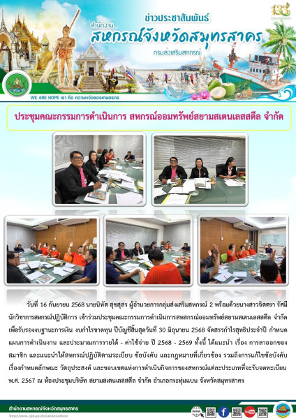 วันที่ 16 กันยายน 2568 นายนิทัต สุขสุสร ผู้อำนวยการกลุ่มส่งเสริมสหกรณ์ 2 พร้อมด้วยนางสาวจิตตรา รัศมี นักวิชาการสหกรณ์ปฏิบัติการ เข้าร่วมประชุมคณะกรรมการดำเนินการสหสกรณ์ออมทรัพย์สยามสเตนเลสสตีล จำกัด เพื่อรับรองงบฐานะการเงิน งบกำไรขาดทุน ปีบัญชีสิ้นสุดวันที่ 30 มิถุนายน 2568 จัดสรรกำไรสุทธิประจำปี กำหนดแผนการดำเนินงาน และประมาณการรายได้ - ค่าใช้จ่าย ปี 2568 - 2569 ทั้งนี้ ได้แนะนำ เรื่อง การลาออกของสมาชิก และแนะนำให้สหกรณ์ปฏิบัติตามระเบียบ ข้อบังคับ และกฎหมายที่เกี่ยวข้อง รวมถึงการแก้ไขข้อบังคับ เรื่องกำหนดลักษณะ วัตถุประสงค์และขอบเขตแห่งการดำเนินกิจการของสหกรณ์แต่ละประเภทที่จะรับจดทะเบียน พ.ศ. 2567 ณ ห้องประชุมบริษัท สยามสเตนเลสสตีล จำกัด อำเภอกระทุ่มแบน จังหวัดสมุทรสาคร