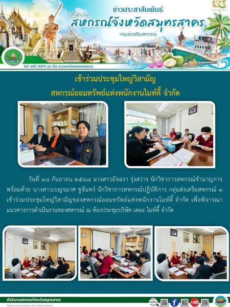 เมื่อวันที่ 18 กันยายน 2568 นางสาวอัจฉรา รุ่งสว่าง นักวิชาการสหกรณ์ชำนาญการ พร้อมด้วย นางสาวเบญจมาศ ชูจันทร์ นักวิชาการสหกรณ์ปฏิบัติการ กลุ่มส่งเสริมสหกรณ์ 1 เข้าร่วมประชุมใหญ่วิสามัญของสหกรณ์ออมทรัพย์แห่งพนักงานไมท์ตี้ จำกัด เพื่อพิจารณาแนวทางการดำเนินงานของสหกรณ์ ณ ห้องประชุมบริษัท เดอะ ไมท์ตี้ จำกัด