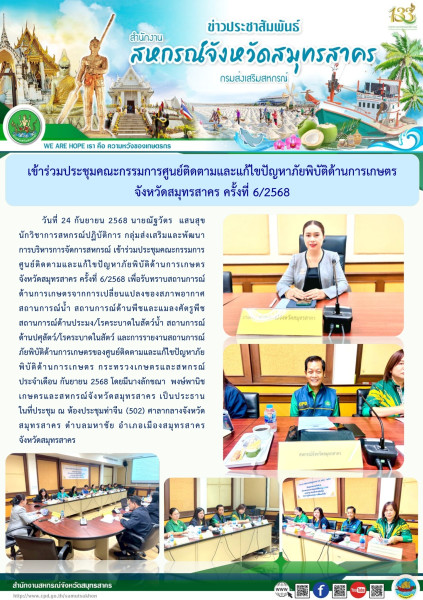 เมื่อวันที่ 24 กันยายน 2568 นายณัฐวัตร แสนสุข นักวิชาการสหกรณ์ปฏิบัติการ กลุ่มส่งเสริมและพัฒนาการบริหารการจัดการสหกรณ์ เข้าร่วมประชุมคณะกรรมการศูนย์ติดตามและแก้ไขปัญหาภัยพิบัติด้านการเกษตร จังหวัดสมุทรสาคร ครั้งที่ 6/2568 เพื่อรับทราบสถานการณ์ด้านการเกษตรจากการเปลี่ยนแปลงของสภาพอากาศ สถานการณ์น้ำ สถานการณ์ด้านพืชและแมลงศัตรูพืช สถานการณ์ด้านประมง/โรคระบาดในสัตว์น้ำ สถานการณ์ด้านปศุสัตว์/โรคระบาดในสัตว์ และการรายงานสถานการณ์ภัยพิบัติด้านการเกษตรของศูนย์ติดตามและแก้ไขปัญหาภัยพิบัติด้านการเกษตร กระทรวงเกษตรและสหกรณ์ ประจำเดือน กันยายน 2568 โดยมีนางลักขณา พงษ์พานิช เกษตรและสหกรณ์จังหวัดสมุทรสาคร เป็นประธานในที่ประชุม ณ ห้องประชุมท่าจีน (502) ศาลากลางจังหวัดสมุทรสาคร ตำบลมหาชัย อำเภอเมืองสมุทรสาคร จังหวัดสมุทรสาคร