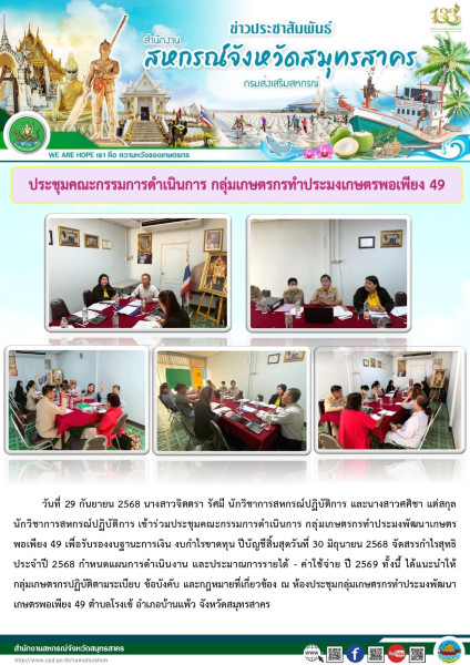 เมื่อวันที่ 29 กันยายน 2568 นางสาวจิตตรา รัศมี นักวิชาการสหกรณ์ปฏิบัติการ และนางสาวศศิชา แต่สกุล นักวิชาการสหกรณ์ปฏิบัติการ เข้าร่วมประชุมคณะกรรมการดำเนินการ กลุ่มเกษตรกรทำประมงพัฒนาเกษตรพอเพียง 49 เพื่อรับรองงบฐานะการเงิน งบกำไรขาดทุน ปีบัญชีสิ้นสุดวันที่ 30 มิถุนายน 2568 จัดสรรกำไรสุทธิประจำปี 2568 กำหนดแผนการดำเนินงาน และประมาณการรายได้ - ค่าใช้จ่าย ปี 2569 ทั้งนี้ ได้แนะนำให้