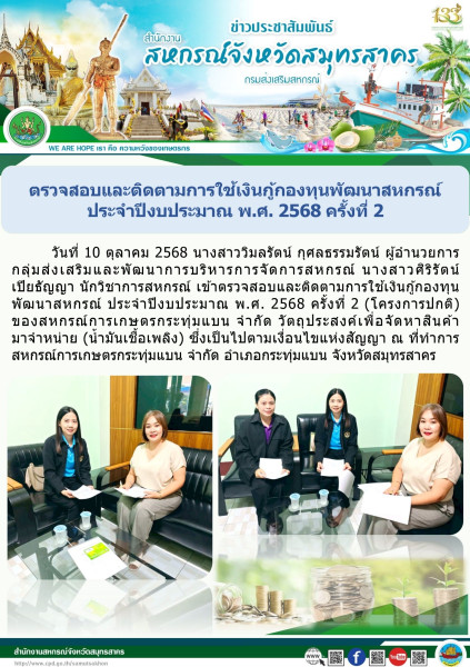 เมื่อวันที่ 10 ตุลาคม 2568 นางสาววิมลรัตน์ กุศลธรรมรัตน์ ผู้อำนวยการกลุ่มส่งเสริมและพัฒนาการบริหารการจัดการสหกรณ์ นางสาวศิริรัตน์ เปียธัญญา นักวิชาการสหกรณ์ เข้าตรวจสอบและติดตามการใช้เงินกู้กองทุนพัฒนาสหกรณ์ ประจำปีงบประมาณ พ.ศ. 2568 ครั้งที่ 2 (โครงการปกติ) ของสหกรณ์การเกษตรกระทุ่มแบน จำกัด วัตถุประสงค์เพื่อจัดหาสินค้ามาจำหน่าย (น้ำมันเชื้อเพลิง) ซึ่งเป็นไปตามเงื่อนไขแห่งสัญญา ณ ที่ทำการสหกรณ์การเกษตรกระทุ่มแบน จำกัด อำเภอกระทุ่มแบน จังหวัดสมุทรสาคร
