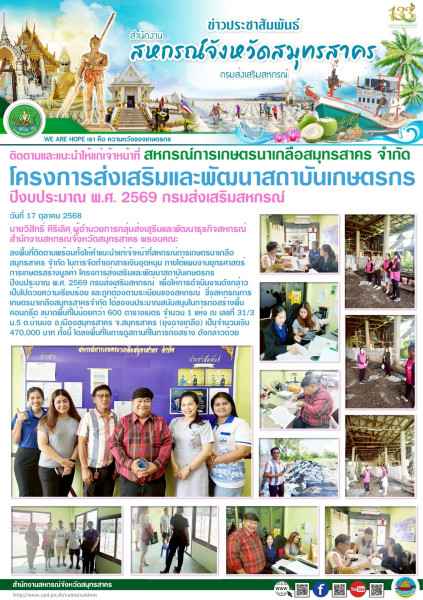 เมื่อวันที่ 17 ตุลาคม 2568 นายวิสิทธิ์ ศิริเลิศ ผู้อำนวยการกลุ่มส่งเสริมและพัฒนาธุรกิจสหกรณ์ สำนักงานสหกรณ์จังหวัดสมุทรสาคร พร้อมคณะลงพื้นที่ติดตามพร้อมทั้งให้คำแนะนำแก่เจ้าหน้าที่สหกรณ์การเกษตรนาเกลือสมุทรสาคร จำกัด ในการจัดทำเอกสารเงินอุดหนุน ภายใต้แผนงานยุทธศาสตร์การเกษตรสร้างมูลค่า โครงการส่งเสริมและพัฒนาสถาบันเกษตรกร ปีงบประมาณ พ.ศ. 2569 กรมส่งเสริมสหกรณ์ เพื่อให้การดำเนินงานดังกล่าวเป็นไปด้วยความเรียบร้อย และถูกต้องตามระเบียบของสหกรณ์ ซึ่งสหกรณ์การเกษตรนาเกลือสมุทรสาคร จำกัด ได้ของบประมาณสนับสนุนในการก่อสร้างพื้นคอนกรีต ขนาดพื้นที่ไม่น้อยกว่า 600 ตารางเมตร จำนวน 1 แห่ง ณ เลขที่ 31/3 ม.5 ต.บ้านบ่อ อ.เมืองสมุทรสาคร จ.สมุทรสาคร (ยุ้งฉางเกลือ) เป็นจำนวนเงิน 470,000 บาท ทั้งนี้ ได้ลงพื้นที่ในการดูสถานที่ในการก่อสร้างดังกล่าวด้วย