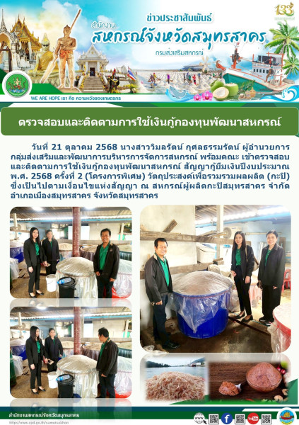 เมื่อวันที่ 21 ตุลาคม 2568 นางสาววิมลรัตน์ กุศลธรรมรัตน์ ผู้อำนวยการกลุ่มส่งเสริมและพัฒนาการบริหารการจัดการสหกรณ์ พร้อมคณะ เข้าตรวจสอบและติดตามการใช้เงินกู้กองทุนพัฒนาสหกรณ์ สัญญากู้ยืมเงินปีงบประมาณ พ.ศ. 2568 ครั้งที่ 2 (โครงการพิเศษ) วัตถุประสงค์เพื่อรวมรวมผลผลิต (กะปิ) ซึ่งเป็นไปตามเงื่อนไขแห่งสัญญา ณ สหกรณ์ผู้ผลิตกะปิสมุทรสาคร จำกัด อำเภอเมืองสมุทรสาคร จังหวัดสมุทรสาคร
