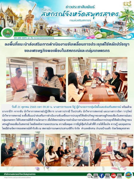 เมื่อวันที่ 21 ตุลาคม 2568 เวลา 09.30 น. นางสาวการะเกด จิอู๋ ผู้อำนวยการกลุ่มจัดตั้งและส่งเสริมสหกรณ์ พร้อมด้วยนางจามีร่า ชาจาฮัน นักวิชาการสหกรณ์ปฏิบัติการ นางสาวปราณี ปิ่นประดับ นักวิชาการสหกรณ์ และนางสาววนิดา วารุรัตน์ นักวิชาการสหกรณ์ ลงพื้นที่แนะนำส่งเสริมการดำเนินงานขับเคลื่อนการประยุกต์ใช้หลักปรัชญาของเศรษฐกิจพอเพียงในสหกรณ์และกลุ่มเกษตรกร ให้กับสหกรณ์ที่เข้าร่วมโครงการ เพื่อให้สหกรณ์สามารถดำเนินการตามโครงการขับเคลื่อนการประยุกต์ใช้หลักปรัชญาของเศรษฐกิจพอเพียงในสหกรณ์ โดยยึดหลักความพอประมาณ ความมีเหตุผล การมีภูมิคุ้มกันในตัวที่ดี ภายใต้เงื่อนไข ความรู้ และคุณธรรม โดยมีฝ่ายจัดการของสหกรณ์เข้ารับฟัง ณ สหกรณ์การเกษตรประสานกสิกิจ จำกัด ตำบลหลักสาม อำเภอบ้านแพ้ว จังหวัดสมุทรสาคร