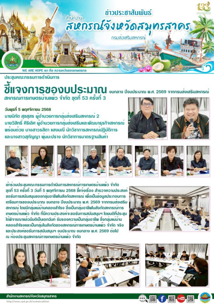 เมื่อวันพุธที่ 5 พฤศจิกายน 2568 นายนิทัต สุขสุสร ผู้อำนวยการกลุ่มส่งเสริมสหกรณ์ 2 นายวิสิทธิ์ ศิริเลิศ ผู้อำนวยการกลุ่มส่งเสริมและพัฒนาธุรกิจสหกรณ์พร้อมด้วย นางสาวรสิตา แสงมณี นักวิชาการสหกรณ์ปฎิบัติการ และนางสาวสุกัญญา พุ่มมะปราง นักวิชาการมาตรฐานสินค้า เข้าร่วมประชุมคณะกรรมการดำเนินการสหกรณ์การเกษตรบ้านแพ้ว จำกัด ชุดที่ 53 ครั้งที่ 3 วันที่ 5 พฤศจิกายน 2568 ชี้แจ้งเรื่อง สำรวจความประสงค์ ขอรับการสนับสนุนของกลุ่มอาชีพในสังกัดสหกรณ์ เพื่อเป็นข้อมูลประกอบการเตรียมการของบประมาณ งบกลาง ปีงบประมาณ พ.ศ. 2569 จากกรมส่งเสริมสหกรณ์ โดยมีกลุ่มแม่บ้านคลองสำโรง ซึ่งเป็นกลุ่มอาชีพในสังกัดสหกรณ์การเกษตรบ้านแพ้ว จำกัด ที่มีความประสงค์จะขอรับการสนับสนุนฯ โดยมติที่ประชุมได้พิจารณาแล้วมีมติเป็นเอกฉันท์ รับรองความเป็นกลุ่มอาชีพ ซึ่งกลุ่มแม่บ้านคลองสำโรงและเป็นกลุ่มในสังกัดของสหกรณ์การเกษตรบ้านแพ้ว จำกัด จริงและประสงค์ขอรับการสนับสนุนฯ งบประมาณ งบกลาง พ.ศ. 2569 ต่อไป ณ ห้องประชุมสหกรณ์การเกษตรบ้านแพ้ว จำกัด