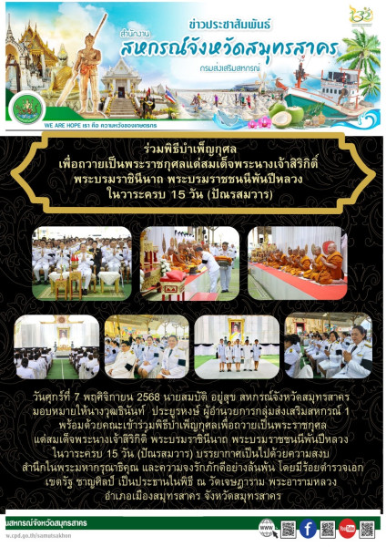 เมื่อวันศุกร์ที่ 7 พฤศิจิกายน 2568 นายสมบัติ อยู่สุข สหกรณ์จังหวัดสมุทรสาคร มอบหมายให้นางวุฒธินันท์ ประยูรหงษ์ ผู้อำนวยการกลุ่มส่งเสริมสหกรณ์ 1 พร้อมคณะเข้าร่วมพิธีบำเพ็ญกุศลเพื่อถวายเป็นพระราชกุศลแด่สมเด็จพระนางเจ้าสิริกิติ์ พระบรมราชินีนาถ พระบรมราชชนนีพันปีหลวง ในวาระครบ 15 วัน (ปัณรสมวาร) บรรยากาศเป็นไปด้วยความสงบ สำนึกในพระมหากรุณาธิคุณ และความจงรักภักดีอย่างล้นพ้น โดยมีร้อยตำรวจเอกเขตรัฐ ชาญศิลป์ เป็นประธานในพิธี ณ วัดเจษฎาราม พระอารามหลวง อำเภอเมืองสมุทรสาคร จังหวัดสมุทรสาคร