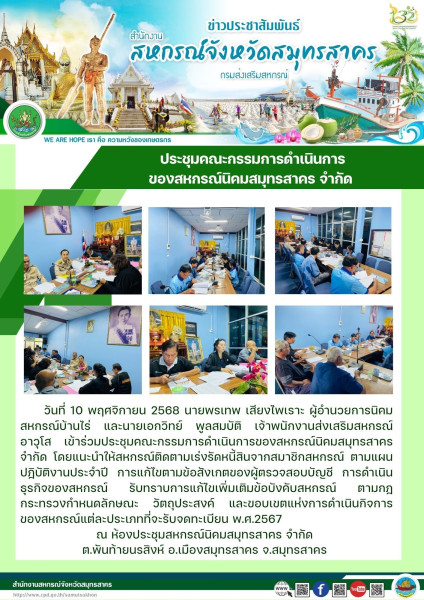 เมื่อวันที่ 10 พฤศจิกายน 2568 นายพรเทพ เสียงไพเราะ ผู้อำนวยการนิคมสหกรณ์บ้านไร่ และนายเอกวิทย์ พูลสมบัติ เจ้าพนักงานส่งเสริมสหกรณ์อาวุโส เข้าร่วมประชุมคณะกรรมการดำเนินการของสหกรณ์นิคมสมุทรสาคร จำกัด โดยแนะนำให้สหกรณ์ติดตามเร่งรัดหนี้สินจากสมาชิกสหกรณ์ ตามแผนปฎิบัติงานประจำปี การแก้ไขตามข้อสังเกตของผู้ตรวจสอบบัญชี การดำเนินธุรกิจของสหกรณ์ รับทราบการแก้ไขเพิ่มเติมข้อบังคับสหกรณ์ ตามกฎกระทรวงกำหนดลักษณะ วัตถุประสงค์ และขอบเขตแห่งการดำเนินกิจการของสหกรณ์แต่ละประเภทที่จะรับจดทะเบียน พ.ศ.2567 ณ ห้องประชุมสหกรณ์นิคมสมุทรสาคร จำกัด ต.พันท้ายนรสิงห์ อ.เมืองสมุทรสาคร จ.สมุทรสาคร