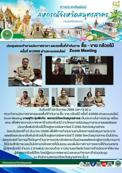 เมื่อวันจันทร์ที่ 29 ธันวาคม 2568 เวลา 13.30 น. คณะทำงานประกาศราคาและลงพื้นที่กำกับการ ซื้อ-ขาย กล้วยไม้ คร้ังที่ 4/2568 ผ่านระบบอนไลน์ Zoom Meeting นายสุกิจ ชุ่มฟักกิจ สหกรณ์จังหวัดสมุทรสาคร เป็นประธานในการประชุม พร้อมคณะ เพื่อพิจารณาประกาศราคาอ้างอิงกล้วยไม้ ตามโครงการสนับสนุนการกระจายผลผลิตและประชาสัมพันธ์กล้วยไม้ไทยสู่ตลาดเชิงพาณิชย์ ปี 2568 จังหวัดสมุทรสาคร (รอบวันจันทร์ที่ 22 ธันวาคม 2568) เพื่อให้การดำเนินงานตามโครงการสนับสนุนการกระจาย ผลผลิตและประชาสัมพันธ์กล้วยไม้ไทยสู่ตลาดเชิงพาณิชย์ ปี 2568 จังหวัดสมุทรสาคร เป็นไปตามวัตถุประสงค์ ในการแก้ไขปัญหาด้านราคาของสมาชิกสหกรณ์ในช่วงผลผลิตออกสู่ตลาดปริมาณมากให้มีประสิทธิภาพ และเป็นไปตามกลไกตลาดที่เป็นธรรม และเพิ่มโอกาสทางการตลาดให้กับเกษตรกร ผู้ปลูกกล้วยไม้ จำนวน 2 สายพันธ์ุ ประกอบด้วย ขาวสนานและโซเนีย โดยการอ้างอิงราคาที่สมาคม ผู้ส่งออกกล้วยไม้ไทย โดยมีผู้แทนภาคสหกรณ์ และคณะทำงานฯ เข้าร่วมประชุม ณ สำนักงานสหกรณ์จังหวัดสมุทรสาคร ชั้น 3