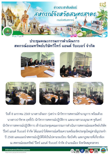 เมื่อันที่ 8 มกราคม 2569 นางสาวอัจฉรา รุ่งสว่าง นักวิชาการสหกรณ์ชำนาญการ พร้อมด้วยนางสาวปาริชาต ฤทธิ์บัว นักวิชาการสหกรณ์ปฏิบัติการ และนางสาวเบญจมาศ ชูจันทร์ นักวิชาการสหกรณ์ปฏิบัติการ เข้าร่วมประชุมคณะกรรมการดำเนินการสหกรณ์ออมทรัพย์บริษัท วีไทร์ แอนด์ รับเบอร์ จำกัด ได้แนะนำให้สหกรณ์เตรียมความพร้อมจัดประชุมใหญ่สามัญประจำปี 2568 และแนะนำสหกรณ์ปฏิบัติให้เป็นไปตามระเบียบ ข้อบังคับ และกฎหมายที่เกี่ยวข้อง ณ สหกรณ์ออมทรัพย์ วีไทร์ แอนด์ รับเบอร์ จำกัด อำเภอเมือง จังหวัดสมุทรสาคร