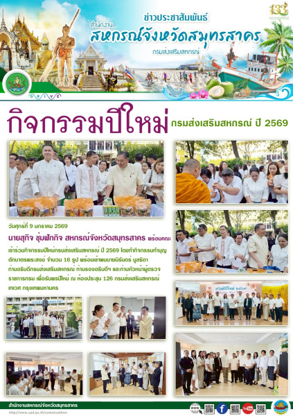 เมื่อวันศุกร์ที่ 9 มกราคม 2569 นายสุกิจ ชุ่มฟักกิจ สหกรณ์จังหวัดสมุทรสาคร พร้อมคณะเข้าร่วมกิจกรรมปีใหม่กรมส่งเสริมสหกรณ์ ปี 2569 โดยทำกิจกรรมทำบุญตักบาตรพระสงฆ์ จำนวน 16 รูป พร้อมเข้าพบนายนิรันดร์ มูลธิดา ท่านอธิบดีกรมส่งเสริมสหกรณ์ ท่านรองอธิบดีฯ และท่านหัวหน้าผู้ตรวจราชการกรม เพื่อรับพรปีใหม่ ณ ห้องประชุม 126 กรมส่งเสริมสหกรณ์ เทเวศ กรุงเทพมหานคร