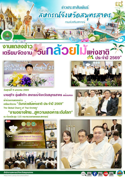 เมื่อวันศุกร์ที่ 9 มกราคม 2569 นายสุกิจ ชุ่มฟักกิจ สหกรณ์จังหวัดสมุทรสาคร พร้อมคณะเข้าร่วมงานแถลงข่าวเตรียมจัดงาน “วันกล้วยไม้แห่งชาติ ประจำปี 2569” The Global Charm of Thai Orchids" "งามอย่างไทย...สู่ความเลอค่าระดับโลก" ณ ห้องประชุม 115 กระทรวงเกษตรและสหกรณ์