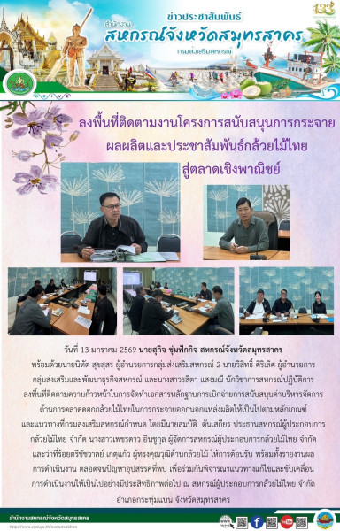เมื่อวันที่ 13 มกราคม 2569 นายสุกิจ ชุ่มฟักกิจ สหกรณ์จังหวัดสมุทรสาคร พร้อมด้วยนายนิทัต สุขสุสร ผู้อำนวยการกลุ่มส่งเสริมสหกรณ์ 2 นายวิสิทธิ์ ศิริเลิศ ผู้อำนวยการกลุ่มส่งเสริม และพัฒนาธุรกิจสหกรณ์ และนางสาวรสิตา แสงมณี นักวิชาการสหกรณ์ปฏิบัติการ ลงพื้นที่ติดตามความก้าวหน้าในการจัดทำเอกสารหลักฐานการเบิกจ่ายการสนับสนุนค่าบริหารจัดการ ด้านการตลาดดอกกล้วยไม้ไทยในการกระจายออกนอกแหล่งผลิตให้เป็นไปตามหลักเกณฑ์และแนวทาง ที่กรมส่งเสริมสหกรณ์กำหนด โดยมีนายสมบัติ ตันเสถียร ประธานสหกรณ์ผู้ประกอบการกล้วยไม้ไทย จำกัด นางสาวเพชรดาว อินชูกุล ผู้จัดการสหกรณ์ผู้ประกอบการกล้วยไม้ไทย จำกัด และว่าที่ร้อยตรีชัชวาลย์ เกตุแก้ว ผู้ทรงคุณวุฒิด้านกล้วยไม้ ให้การต้อนรับ พร้อมทั้งรายงานผลการดำเนินงาน ตลอดจนปัญหาอุปสรรคที่พบ เพื่อร่วมกันพิจารณา แนวทางแก้ไขและขับเคลื่อนการดำเนินงานให้เป็นไปอย่างมีประสิทธิภาพต่อไป ณ สหกรณ์ผู้ประกอบการกล้วยไม้ไทย จำกัด อำเภอกระทุ่มแบน จังหวัดสมุทรสาคร