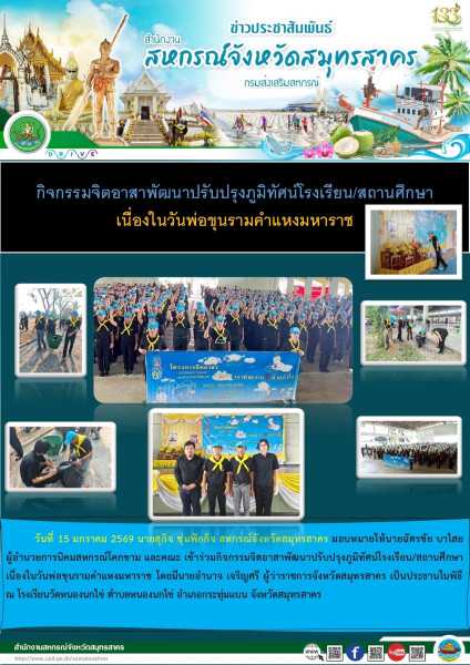 วันที่ 15 มกราคม 2569 นายสุกิจ ชุ่มฟักกิจ สหกรณ์จังหวัดสมุทรสาคร มอบหมายให้นายฉัตรชัย บาไสย ผู้อำนวยการนิคมสหกรณ์โคกขาม และคณะ เข้าร่วมกิจกรรมจิตอาสาพัฒนาปรับปรุงภูมิทัศน์โรงเรียน/สถานศึกษา เนื่องในวันพ่อขุนรามคำแหงมหาราช โดยมีนายอำนาจ เจริญศรี ผู้ว่าราชการจังหวัดสมุทรสาคร เป็นประธานในพิธี ณ โรงเรียนวัดหนองนกไข่ ตำบลหนองนกไข่ อำเภอกระทุ่มแบน จังหวัดสมุทรสาคร