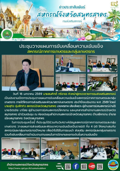 >>วันที่ 16 มกราคม 2569 นายสมศักดิ์ กรีธาธร หัวหน้าผู้ตรวจราชการรมส่งเสริมสหกรณ์ เป็นประธานเปิดการประชุมวางแผนการขับเคลื่อนความเข้มแข็งสหกรณ์ภาคการเกษตรและกลุ่มเกษตรกร ภายใต้โครงการส่งเสริมและพัฒนาสถาบันเกษตรกร ประจำปีงบประมาณ พ.ศ. 2569 โดยมี นายสุกิจ ชุ่มฟักกิจ สหกรณ์จังหวัดสมุทรสาคร นายพรเทพ เสียงไพเราะ ผู้อำนวยการนิคมสหกรณ์บ้านไร่ นายฉัตรชัย บาไสย ผู้อำนวยการนิคมสหกรณ์โคกขาม และบุคลากรสำนักงานสหกรณ์จังหวัดสมุทรสาคร เข้าร่วมประชุม ณ ห้องประชุมสำนักงานสหกรณ์จังหวัดสมุทรสาคร ตำบลโคกขาม อำเภอเมืองสมุทรสาคร จังหวัดสมุทรสาคร