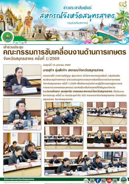 เมื่อวันศุกร์ที่ 16 มกราคม 2569 นายสุกิจ ชุ่มฟักกิจ สหกรณ์จังหวัดสมุทรสาคร มอบหมายให้ นางสาวสุกัญญา พุ่มมะปราง นักวิชาการมาตรฐานสินค้า กลุ่มส่งเสริมและพัฒนาธุรกิจสหกรณ์ เข้าร่วมประชุมคณะกรรมการขับเคลื่อนงานด้านการเกษตร จังหวัดสมุทรสาคร ครั้งที่ 1/2569 เพื่อติดตามเร่งรัดการปฏิบัติงานของผู้ตรวจราชการกระทรวงเกษตรและสหกรณ์ และคัดเลือกสินค้าเกษตรที่สำคัญของจังหวัด โดยมีนางลักขณา พงษ์พานิช เกษตรและสหกรณ์จังหวัดสมุทรสาคร เป็นประธาน ในการประชุม ครั้งนี้ ณ ห้องประชุมท่าจีน 502 ศาลากลางจังหวัดสมุทรสาคร อำเภอเมือง สมุทรสาคร จังหวัดสมุทรสาคร
