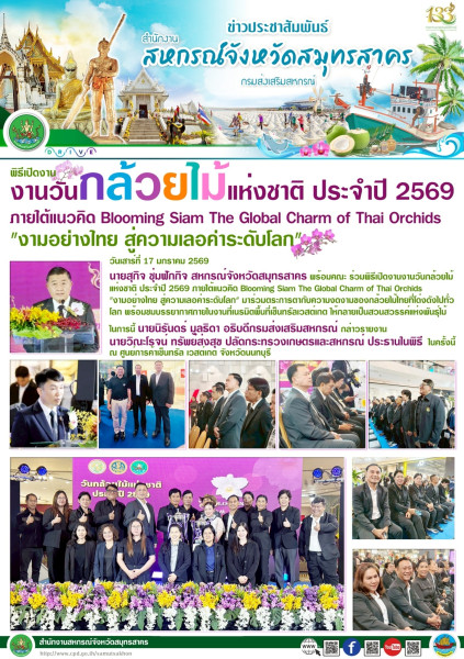 เมื่อวันเสาร์ที่ 17 มกราคม 2569 นายสุกิจ ชุ่มฟักกิจ สหกรณ์จังหวัดสมุทรสาคร พร้อมคณะ ร่วมพิธีเปิดงานงานวันกล้วยไม้แห่งชาติ ประจําปี 2569 ภายใต้แนวคิด Blooming Siam The Global Charm of Thai Orchids "งามอย่างไทย สู่ความเลอค่าระดับโลก" มาร่วมตระการตากับความงดงามของกล้วยไม้ไทยที่โด่งดังไปทั่วโลก พร้อมชมบรรยากาศภายในงานที่เนรมิตพื้นที่เซ็นทรัลเวสต์เกต ให้กลายเป็นสวนสวรรค์แห่งพันธุ์ไม้ ในการนี้ นายนิรันดร์ มูลธิดา อธิบดีกรมส่งเสริมสหกรณ์ กล่าวรายงาน นายวิณะโรจน์ ทรัพย์ส่งสุข ปลัดกระทรวงเกษตรและสหกรณ์ ประธานในพิธี ในครั้งนี้ ณ ศูนย์การค้าเซ็นทรัล เวสต์เกต จังหวัดนนทบุรี