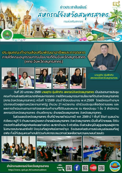 >> วันที่ 20 มกราคม 2569 นายสุกิจ ชุ่มฟักกิจ สหกรณ์จังหวัดสมุทรสาคร เป็นประธานการประชุมคณะทำงานส่งเสริมพัฒนาอาชีพและการตลาด ภายใต้คณะอนุกรรมการนโยบายที่ดินจังหวัดสมุทรสาคร (คทช.จังหวัดสมุทรสาคร) ครั้งที่ 1/2569 ประจำปีงบประมาณ พ.ศ.2569 โดยมีคณะทำงานฯ ประกอบด้วยผู้แทนหน่วยงานภาครัฐ จำนวน 21 หน่วยงาน เข้าร่วมประชุมเพื่อติดตามแผน และผลการดำเนินงานตามภารกิจของคณะทำงานที่ได้รับมอบหมาย ณ ห้องประชุม 1 ชั้น 3 สำนักงานสหกรณ์จังหวัดสมุทรสาคร ตำบลโคกขาม อำเภอเมืองสมุทรสาคร จังหวัดสมุทรสาคร