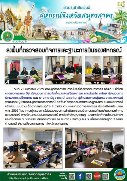 เมื่อวันที่ 23 มกราคม 2569 คณะผู้ตรวจการสหกรณ์ประจำจังหวัดสมุทรสาคร คณะที่ 5 นำโดย นางสาวการะเกด จิอู๋ ผู้อำนวยการกลุ่มจัดตั้งและส่งเสริมสหกรณ์ นายฉัตรชัย บาไสย ผู้อำนวยการนิคมสหกรณ์โคกขาม และ นางสาวณัฐชาภรณ์ เฉลยถิ่น ผู้อำนวยการกลุ่มตรวจากรสหกรณ์ พร้อมด้วยผู้ช่วยคณะผู้ตรวจการสหกรณ์ ลงพื้นที่ตรวจสอบกิจการและฐานะการเงินของสหกรณ์บริการชุมชนบ้านเอื้ออาทรเศรษฐกิจ 3 จำกัด ตามแผนตรวจการสหกรณ์ ประจำปีงบประมาณ พ.ศ. 2569 โดย คณะผู้ตรวจการได้ตรวจสอบการดำเนินการตามวัตถุประสงค์และอำนาจกระทำการ ของสหกรณ์ การกำหนดระเบียบของสหกรณ์ การจัดทำสัญญาเงินกู้ และการจัดทำทะเบียนคุมต่างๆ และเรื่องอื่นๆ ที่นายทะเบียนสหกรณ์กำหนด ณ สหกรณ์บริการชุมชนบ้านเอื้ออาทรเศรษฐกิจ 3 จำกัด ตำบลนาดี อำเภอเมืองสมุทรสาคร จังหวัดสมุทรสาคร