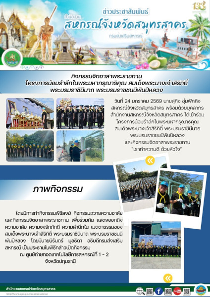 เมื่อวันที่ 24 มกราคม 2569 นายสุกิจ ชุ่มฟักกิจ สหกรณ์จังหวัดสมุทรสาคร พร้อมด้วยบุคลากรสำนักงานสหกรณ์จังหวัดสมุทรสาคร ได้เข้าร่วมโครงการน้อมรำลึกในพระมหากรุณาธิคุณ สมเด็จพระนางเจ้าสิริกิติ์ พระบรมราชินีนาถ พระบรมราชชนนีพันปีหลวง และกิจกรรมจิตอาสาพระราชทาน “เราทำความดี ด้วยหัวใจ” โดยมีการทำกิจกรรมพิธีสงฆ์ กิจกรรมถวายความอาลัย และกิจกรรมจิตอาสาพระราชทาน เพื่อร่วมกันแสดงออกถึงความอาลัย ความจงรักภักดี ความสำนึกในเมตตาธรรมของสมเด็จพระนางเจ้าสิริกิติ์ พระบรมราชินีนาถ พระบรมราชชนนีพันปีหลวง โดยมีนายนิรันดร์ มูลธิดา อธิบดีกรมส่งเสริมสหกรณ์ เป็นประธานในพิธีกล่าวเปิดกิจกรรม ณ ศูนย์ถ่ายทอดเทคโนโลยีการสหกรณ์ที่ 1 – 2 จังหวัดปทุมธานี