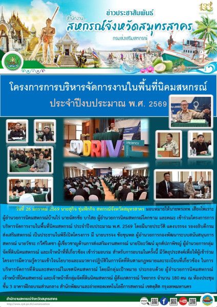 เมื่อวันที่ 26 มกราคม 2569 นายสุกิจ ชุ่มฟักกิจ สหกรณ์จังหวัดสมุทรสาคร มอบหมายให้นายพรเทพ เสียงไพเราะ ผู้อำนวยการนิคมสหกรณ์บ้านไร่ นายฉัตรชัย บาไสย ผู้อำนวยการนิคมสหกรณ์โคกขาม และคณะ เข้าร่วมโครงการการบริหารจัดการงานในพื้นที่นิคมสหกรณ์ ประจำปีงบประมาณ พ.ศ. 2569 โดยมีนายประวัติ แดงบรรจง รองอธิบดีกรมส่งเสริมสหกรณ์ เป็นประธานในพิธีเปิดโครงการ มี นายบรรจง ชัยขุนพล ผู้อำนวยการกองพัฒนาระบบสนันสนุนการสหกรณ์ นายวัชระ กวีศรีเดชา ผู้เชี่ยวชาญด้านการส่งเสริมงานสหกรณ์ นายปิยะวัฒน์ มุกต์ปภาพิชญ์ ผู้อำนวยการกลุ่มจัดที่ดินนิคมสหกรณ์ และเจ้าหน้าที่ที่เกี่ยวข้อง เข้าร่วมอบรม สำหรับการอบรมในครั้งนี้ มีวัตถุประสงค์เพื่อให้ผู้เข้าร่วมโครงการมีความรู้ความเข้าใจนโยบายและแนวทางปฏิบัติในการจัดที่ดินตามกฎหมายและระเบียบที่เกี่ยวข้อง ในการบริหารจัดการที่ดินและสหกรณ์ในเขตนิคมสหกรณ์ โดยมีกลุ่มเป้าหมาย ประกอบด้วย ผู้อำนวยการนิคมสหกรณ์ เจ้าหน้าที่นิคมสหกรณ์ และเจ้าหน้าที่กลุ่มจัดที่ดินนิคมสหกรณ์ ผู้สังเกตการณ์ วิทยากร จำนวน 180 คน ณ ห้องประชุม ชั้น 3 อาคารฝึกอบรมส่วนกลาง สำนักพัฒนาและถ่ายทอดเทคโนโลยีการสหกรณ์ เขตดุสิต กรุงเทพมหานคร