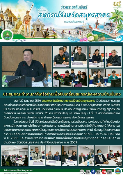 >> วันที่ 27 มกราคม 2569 นายสุกิจ ชุ่มฟักกิจ สหกรณ์จังหวัดสมุทรสาคร เป็นประธานการประชุมคณะทำงานภาคีเครือข่ายเพื่อขับเคลื่อนสหกรณ์เคหสถานบ้านมั่นคง จังหวัดสมุทรสาคร ครั้งที่ 1/2569 ประจำปีงบประมาณ พ.ศ. 2569 โดยมีคณะทำงานฯ ประกอบด้วยผู้แทนหน่วยงานภาครัฐ รัฐวิสาหกิจ ภาคเอกชน และภาคประชาชน จำนวน 25 คน เข้าร่วมประชุม ณ ห้องประชุม 1 ชั้น 3 สำนักงานสหกรณ์จังหวัดสมุทรสาคร ตำบลโคกขาม อำเภอเมืองสมุทรสาคร จังหวัดสมุทรสาคร