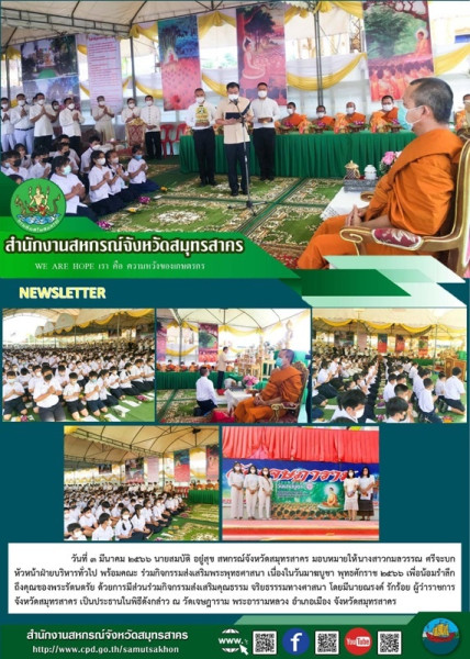 เมื่อวันที่ 3 มีนาคม 2566 นายสมบัติ อยู่สุข สหกรณ์จังหวัดสมุทรสาคร มอบหมายให้นางสาวกมลวรรณ ศรีจะบก หัวหน้าฝ่ายบริหารทั่วไป พร้อมคณะ ร่วมกิจกรรมส่งเสริมพระพุทธศาสนา เนื่องในวันมาฆบูชา พุทธศักราช 2566 เพื่อน้อมรำลึกถึงคุณของพระรัตนตรัย ด้วยการมีส่วนร่วมกิจกรรมส่งเสริมคุณธรรม จริยธรรรมทางศาสนา โดยมีนายณรงค์ รักร้อย ผู้ว่าราชการจังหวัดสมุทรสาคร เป็นประธานในพิธีดังกล่าว ณ วัดเจษฎาราม พระอารามหลวง อำเภอเมือง จังหวัดสมุทรสาคร