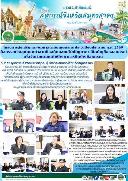 เมื่อวันที่ 13 กุมภาพันธ์ 2569 นายสุกิจ ชุ่มฟักกิจ สหกรณ์จังหวัดสมุทรสาคร เป็นประธานเปิดโครงการส่งเสริมและพัฒนาสถาบันเกษตรกร ประจำปีงบประมาณ พ.ศ. 2569 กิจกรรมประชุมคณะทำงานป้องกันและแก้ไขปัญหาการปิดบัญชีของสหกรณ์เพื่อจัดทำแผนแก้ไขปัญหาการปิดบัญชีสหกรณ์ ประกอบด้วย นางสาววิมลรัตน์ กุศลธรรมรัตน์ ผู้อำนวยการกลุ่มส่งเสริมและพัฒนาการบริหารการจัดการสหกรณ์ นายนิทัต สุขสุสร ผู้อำนวยการกลุ่มส่งเสริมสหกรณ์ 2 ผู้แทนสหกรณ์นอกภาคการเกษตรเป้าหมาย เจ้าหน้าที่สำนักงานสหกรณ์จังหวัดสมุทรสาคร และผู้แทนสำนักงานตรวจบัญชีสหกรณ์สมุทรสาคร เข้าร่วมประชุม โดยมีวัตถุประสงค์เพื่อจัดทำแผนป้องกันและแก้ไขปัญหาการปิดบัญชีสหกรณ์เป้าหมายให้สามารถปิดบัญชีได้ ขับเคลื่อนและติดตามผลการแก้ไขปัญหาการปิดบัญชี ส่งเสริมและพัฒนาสหกรณ์ให้สามารถจัดการองค์กรให้เหมาะสมกับขนาดและกิจกรรมของสหกรณ์ มีแผนการยกระดับศักยภาพองค์กรพร้อมขับเคลื่อนแผน เพิ่มความสามารถในการให้บริการสมาชิก การบริหารจัดการองค์กร การพัฒนาในด้านบุคลากรสหกรณ์ และเพิ่มขีดความสามารถในการแข่งขันอย่างเหมาะสม เพื่อให้เกิดกระบวนการพัฒนาและเกื้อกูลในการสร้างความเข้มแข็งในห่วงโซ่ธุรกิจของระบบสหกรณ์ ณ ห้องประชุมสำนักงานสหกรณ์จังหวัดสมุทรสาคร ตำบลโคกขาม อำเภอเมืองสมุทรสาคร จังหวัดสมุทรสาคร