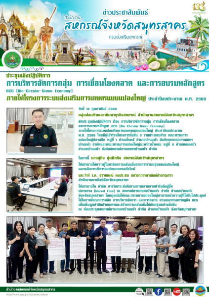 เมื่อวันที่ 18 กุมภาพันธ์ 2569 กลุ่มส่งเสริมและพัฒนาธุรกิจสหกรณ์ สำนักงานสหกรณ์จังหวัดสมุทรสาคร จัดประชุมเชิงปฏิบัติการ เรื่อง การบริหารจัดการกลุ่ม การเชื่อมโยงตลาด และการอบรมหลักสูตร BCG (Bio-Circular-Green Economy) ภายใต้โครงการระบบส่งเสริมการเกษตรแบบแปลงใหญ่ ประจำปีงบประมาณ พ.ศ. 2569 โดยมีผู้เข้าร่วมโครงการทั้งสิ้น 9 รายประกอบด้วย คณะกรรมการ แปลงใหญ่ปลาสลิด หมู่ที่ 1 ตำบลโรงเข้ อำเภอบ้านแพ้ว สังกัดสหกรณ์การเกษตร บ้านแพ้ว จำกัดและคณะกรรมการแปลงใหญ่มะพร้าวน้ำหอม หมู่ที่ 9 ตำบลหนองบัว อำเภอบ้านแพ้ว สังกัดสหกรณ์การเกษตรบ้านแพ้ว จำกัด ในการนี้ นายสุกิจ ชุ่มฟักกิจ สหกรณ์จังหวัดสมุทรสาคร ได้บรรยายให้ความรู้ในหัวข้อ ความเข้มแข็งจากการรวมกลุ่มของแปลงใหญ่ และหลักการบริหารองค์กรเกษตรสมัยใหม่ และว่าที่ ร.ต. ฐิวาณพฒ์ คงประสม นักวิชาการพาณิชย์ชำนาญการ สำนักงานพาณิชย์ จังหวัดสมุทรสาคร ได้บรรยายใน หัวข้อ การวิเคราะห์เส้นทางการตลาดจากฟาร์มถึงผู้ซื้อปลายทาง (Market Flow) ณ สหกรณ์การเกษตรบ้านแพ้ว จำกัด อำเภอบ้านแพ้ว จังหวัดสมุทรสาคร โดยมุ่งเน้นให้คณะกรรมการแปลงใหญ่สามารถนำความรู้ที่ได้รับไปประยุกต์ ใช้ในการพัฒนาการผลิต การบริหารจัดการ และการตลาด ตามแนวทางเศรษฐกิจ BCG เพื่อเพิ่มมูลค่าสินค้าเกษตรและสร้างความเข้มแข็งให้กับกลุ่มอย่างยั่งยืน ณ ห้องประชุมสหกรณ์การเกษตรบ้านแพ้ว จำกัด อำเภอบ้านแพ้ว จังหวัดสมุทรสาคร