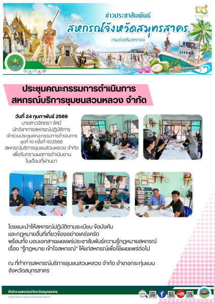 เมื่อวันที่ 24 กุมภาพันธ์ 2569 นางสาวจิตตรา รัศมี นักวิชาการสหกรณ์ปฏิบัติการ เข้าร่วมประชุมคณะกรรมการดำเนินการชุดที่ 10 ครั้งที่ 10/2568 สหกรณ์บริการชุมชนสวนหลวง จำกัด เพื่อรับทราบผลการดำเนินงานในเดือนที่ผ่านมา โดยแนะนำให้สหกรณ์ปฏิบัติตามระเบียบ ข้อบังคับ และกฎหมายอื่นที่เกี่ยวข้องอย่างเคร่งครัด พร้อมทั้ง มอบเอกสารเผยแพร่ประชาสัมพันธ์ความรู้กฎหมายสหกรณ์ เรื่อง “รู้กฎหมาย เข้าใจสหกรณ์” ให้แก่สหกรณ์เพื่อใช้เผยแพร่ต่อไป ณ ที่ทำการสหกรณ์บริการชุมชนสวนหลวง จำกัด อำเภอกระทุ่มแบน จังหวัดสมุทรสาคร