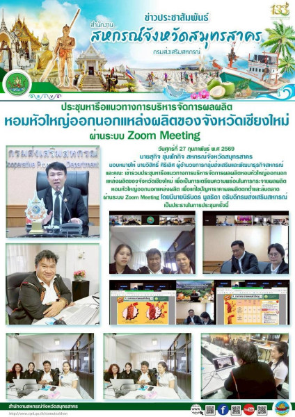 เมื่อวันศุกร์ที่ 27 กุมภาพันธ์ พ.ศ 2569 นายสุกิจ ชุ่มฟักกิจ สหกรณ์จังหวัดสมุทรสาคร มอบหมายให้ นายวิสิทธิ์ ศิริเลิศ ผู้อำนวยการกลุ่มส่งเสริมและพัฒนาธุรกิจสหกรณ์และคณะ เข้าร่วมประชุมหารือแนวทางการบริหารจัดการผลผลิตหอมหัวใหญ่ออกนอกแหล่งผลิตของจังหวัดเชียงใหม่ เพื่อเป็นการเตรียมความพร้อมในการกระจายผลผลิตหอมหัวใหญ่ออกนอกแหล่งผลิต เพื่อแก้ไขปัญหาราคาผลผลิตตกต่ำและล้นตลาด ผ่านระบบ Zoom Meeting โดยมีนายนิรันดร์ มูลธิดา อธิบดีกรมส่งเสริมสหกรณ์ เป็นประธานในการประชุมครั้งนี้