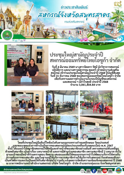 เมื่อวันที่ 4 มีนาคม 2569 นางสาวจิตตรา รัศมี นักวิชาการสหกรณ์ปฏิบัติการ และนางสาวณัฐวรรณ คูณทวี เจ้าพนักงานส่งเสริมสหกรณ์ เข้าร่วมประชุมใหญ่สามัญประจำปี 2568 ปีบัญชีสิ้นสุด วันที่ 31 ธันวาคม 2568 ของสหกรณ์ออมทรัพย์ไทยโอซูก้า จำกัด เพื่อรับทราบผลการดำเนินงานในรอบปีบัญชีของสหกรณ์และสหกรณ์ ฯ มีกำไรสุทธิ ประจำปี 2568 จำนวน 3,061,404.84 บาท โดยที่ประชุมใหญ่มีมติแก้ไขข้อบังคับตามกฎกระทรวงกำหนดลักษณะ วัตถุประสงค์และขอบเขตแห่งการดำเนินกิจการของสหกรณ์แต่ละประเภทที่จะรับจดทะเบียน พ.ศ. 2567 ทั้งนี้ ได้แนะนำให้สมาชิกสหกรณ์ใช้สิทธิและทำหน้าที่ของสมาชิกอย่างเต็มที่ เพราะสหกรณ์ขับเคลื่อนด้วยพลังสมาชิก เน้นย้ำเรื่อง บทบาทหน้าที่ และการมีส่วนร่วมของสมาชิก เพราะสมาชิกมี 2 บทบาท ทั้งในฐานะเจ้าของมีหน้าที่ร่วมตรวจสอบ ติดตาม เสนอแนะเพื่อให้คณะกรรมการนำไปพัฒนาบริการให้ตรงกับความต้องการของสมาชิก และในฐานะผู้ใช้บริการหากสมาชิกร่วมใช้บริการกับสหกรณ์ก็จะส่งผลกลับมาเป็นสวัสดิการและเงินปันผลให้กับสมาชิกต่อไป รวมถึง แจ้งผลการจัดชั้นความเข้มแข็งของสหกรณ์ ปี 2568 ณ อาคารพนักงานหน้าสำนักงานสหกรณ์ บริษัท ไทยโอซูก้า จำกัด อำเภอกระทุ่มแบน จังหวัดสมุทรสาคร