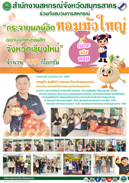 เมื่อวันอังคารที่ 10 มีนาคม พ.ศ. 2569 นายสุกิจ ชุ่มฟักกิจ สหกรณ์จังหวัดสมุทรสาคร พร้อมด้วย บุคลากรสำนักงานสหกรณ์จังหวัดสมุทรสาคร ร่วมกระจายหอมหัวใหญ่ ของสมาชิก/เกษตรกร จังหวัดเชียงใหม่ เพื่อช่วยเหลือ สมาชิกสหกรณ์/เกษตรกร โดยการกระจายผลผลิตหอมหัวใหญ่ ออกนอกแหล่งผลิต และแก้ไขปัญหาราคาผลผลิตตกต่ำ โดยผ่านเครือข่ายกระบวนการสหกรณ์ในจังหวัดสมุทรสาคร ณ สหกรณ์การเกษตรบ้านแพ้ว จำกัด สหกรณ์การเกษตรประสานกสิกิจ จำกัด สหกรณ์การเกษตรกระทุ่มแบน จำกัด และสหกรณ์การเกษตรนาเกลือสมุทรสาคร จำกัด