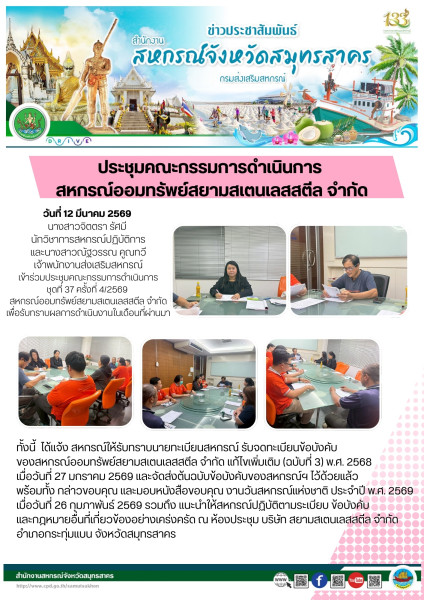 เมื่อวันที่ 12 มีนาคม 2569 นางสาวจิตตรา รัศมี นักวิชาการสหกรณ์ปฏิบัติการ และนางสาวณัฐวรรณ คูณทวี เจ้าพนักงานส่งเสริมสหกรณ์ เข้าร่วมประชุมคณะกรรมการดำเนินการ ชุดที่ 37 ครั้งที่ 4/2569 สหกรณ์ออมทรัพย์สยามสเตนเลสสตีล จำกัด เพื่อรับทราบผลการดำเนินงานในเดือนที่ผ่านมา ทั้งนี้ ได้แจ้ง สหกรณ์ให้รับทราบนายทะเบียนสหกรณ์ รับจดทะเบียนข้อบังคับของสหกรณ์ออมทรัพย์สยามสเตนเลสสตีล จำกัด แก้ไขเพิ่มเติม (ฉบับที่ 3) พ.ศ. 2568 เมื่อวันที่ 27 มกราคม 2569 และจัดส่งต้นฉบับข้อบังคับของสหกรณ์ฯ ไว้ด้วยแล้ว พร้อมทั้ง กล่าวขอบคุณ และมอบหนังสือขอบคุณ งานวันสหกรณ์แห่งชาติ ประจำปี พ.ศ. 2569 เมื่อวันที่ 26 กุมภาพันธ์ 2569 รวมถึง แนะนำให้สหกรณ์ปฏิบัติตามระเบียบ ข้อบังคับ และกฎหมายอื่นที่เกี่ยวข้องอย่างเคร่งครัด ณ ห้องประชุม บริษัท สยามสเตนเลสสตีล จำกัด อำเภอกระทุ่มแบน จังหวัดสมุทรสาคร
