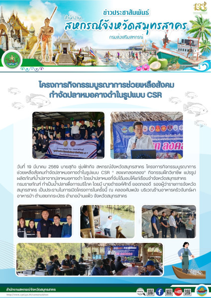 เมื่อวันที่ 19 มีนาคม 2569 นายสุกิจ ชุ่มฟักกิจ สหกรณ์จังหวัดสมุทรสาคร โครงการกิจกรรมบูรณาการช่วยเหลือสังคมกำจัด ปลาหมอคางดำในรูปแบบ CSR “ ลงแขกลงคลอง” กิจกรรมฝึกวิชาชีพ แปรรูปผลิตภัณฑ์น้ำปลาจากปลาหมอคางดำ โดยนำปลาหมอที่จับได้มอบให้แก่เรือนจำจังหวัดสมุทรสาคร กรมราชทัณฑ์ ทำเป็นน้ำปลาเพื่อการบริโภค โดยมี นายดํารงค์ศักดิ์ ยอดทองดี รองผู้ว่าราชการจังหวัดสมุทรสาคร เป็นประธานในการเปิดโครงการในครั้งนี้ ณ คลองคันพนัง บริเวณร้านอาหารครัวจันทร์ผาอาหารป่า ตำบลยกกระบัตร อำเภอบ้านแพ้ว จังหวัดสมุทรสาคร