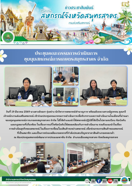 เมื่อวันที่ 19 มีนาคม 2569 นางสาวอัจฉรา รุ่งสว่าง นักวิชาการสหกรณ์ชำนาญการ พร้อมด้วยนางสาวณัฐวรรณ คูณทวี เจ้าพนักงานส่งเสริมสหกรณ์ เข้าร่วมประชุมคณะกรรมการดำเนินการเพื่อรับทราบผลการดำเนินงานใน เดือนที่ผ่านมา ของชุมนุมสหกรณ์การเกษตรสมุทรสาคร จำกัด ได้ให้คำแนะนำให้สหกรณ์ปฏิบัติให้เป็นไปตามระบียบ ข้อบังคับ และกฎหมายที่เกี่ยวข้องในเรื่องการแก้ไขข้อบังคับให้สอดคล้องกับการดำเนินงาน รวมถึงแนะนำในเรื่องการดำเนินธุรกิจของสหกรณ์ในเรื่องการเชื่อมโยงสินค้าระหว่างสหกรณ์ เพื่อช่วยกระจายสินค้าของสหกรณ์ที่เป็นสมาชิก และเป็นการช่วยเหลือเกษตรกรที่กำลังประสบปัญหาราคาสินค้าเกษตรตกต่ำ ณ ห้องประชุมสหกรณ์พัฒนาการประมงมหาชัย จำกัด อำเภอเมืองสมุทรสาคร จังหวัดสมุทรสาคร
