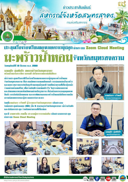 วันพฤหัสบดีที่ 19 มีนาคม พ.ศ. 2569 นายสุกิจ ชุ่มฟักกิจ สหกรณ์จังหวัดสมุทรสาคร พร้อมด้วยนางสาวรสิตา แสงมณี นักวิชาการสหกรณ์ปฏิบัติการ เข้าร่วมประชุมหารือกรณีเรื่องร้องเรียนของเกษตรกรผู้ปลูกมะพร้าวน้ำหอมจังหวัดสมุทรสงคราม ที่ประสบปัญหาราคาผลผลิตตกต่ำ การปลอมปนน้ำมะพร้าว และผลกระทบจากการดำเนินธุรกิจของทุนข้ามชาติ โดยมีหน่วยงานที่เกี่ยวข้องเข้าร่วมอย่างพร้อมเพรียง เพื่อร่วมกันพิจารณาข้อเท็จจริง วิเคราะห์สถานการณ์ และกำหนดแนวทางแก้ไขปัญหาอย่างเป็นรูปธรรม ทั้งในด้านการควบคุมคุณภาพสินค้า การบังคับใช้กฎหมาย และการพัฒนาตลาดมะพร้าวน้ำหอมให้เกิดความเป็นธรรมต่อเกษตรกรและผู้ประกอบการในระยะยาว