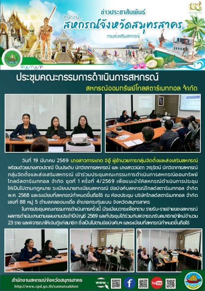 เมื่อวันที่ 19 มีนาคม 2569 นางสาวการะเกด จิอู๋ ผู้อำนวยการกลุ่มจัดตั้งและส่งเสริมสหกรณ์ พร้อมด้วยนางสาวปราณี ปิ่นประดับ นักวิชาการสหกรณ์ และ นางสาววนิดา วารุรัตน์ นักวิชาการสหกรณ์ กลุ่มจัดตั้งและส่งเสริมสหกรณ์ เข้าร่วมประชุมคณะกรรมการดำเนินการสหกรณ์ออมทรัพย์โกลด์สตาร์เมททอล จำกัด ชุดที่ 1 ครั้งที่ 4/2569 เพื่อแนะนำให้สหกรณ์ดำเนินการประชุมให้เป็นไปตามกฎหมาย ระเบียบนายทะเบียนสหกรณ์ ข้อบังคับสหกรณ์โกลด์สตาร์เมททอล จำกัด พ.ศ. 2568 และระเบียบที่สหกรณ์กำหนดขึ้นถือใช้ ณ ห้องประชุม บริษัทโกลด์สตาร์เมททอล จำกัด เลขที่ 88 หมู่ 5 ตำบลคลองมะเดื่อ อำเภอกระทุ่มแบน จังหวัดสมุทรสาคร