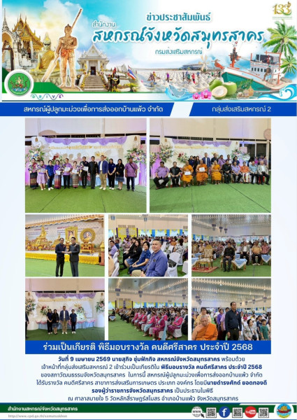 เมื่อวันที่ 9 เมษายน 2569 นายสุกิจ ชุ่มฟักกิจ สหกรณ์จังหวัดสมุทรสาคร พร้อมด้วย เจ้าหน้าที่กลุ่มส่งเสริมสหกรณ์ 2 เข้าร่วมเป็นเกียรติใน พิธีมอบรางวัล คนดีศรีสาคร ประจำปี 2568 ของสภาวัฒนธรรมจังหวัดสมุทรสาคร ในการนี้ สหกรณ์ผู้ปลูกมะม่วงเพื่อการส่งออกบ้านแพ้ว จำกัด ได้รับรางวัล คนดีศรีสาคร สาขาการส่งเสรีมการเกษตร ประเภท องค์กร โดยมีนายดำรงศักด์ ยอดทองดี รองผู้ว่าราชการจังหวัดสมุทรสาคร เป็นประธานในพิธี ณ ศาลาสบายใจ 5 วัดหลักสี่ราษฎร์สโมสร อำเภอบ้านแพ้ว จังหวัดสมุทรสาคร