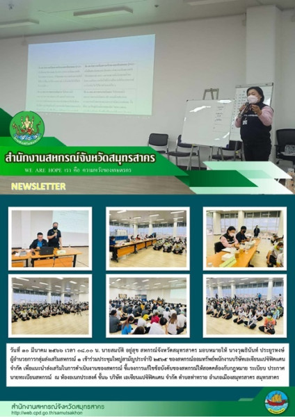 เมื่อวันที่ 30 มีนาคม 2566 เวลา 08.00 น. นายสมบัติ อยู่สุข สหกรณ์จังหวัดสมุทรสาคร มอบหมายให้ นางวุฒธินันท์ ประยูรหงษ์ ผู้อำนวยการกลุ่มส่งเสริมสหกรณ์ 1 เข้าร่วมประชุมใหญ่สามัญประจำปี 2565 ของสหกรณ์ออมทรัพย์พนักงานบริษัทเอเซียนแปซิฟิคแคน จำกัด เพื่อแนะนำส่งเสริมในการดำเนินงานของสหกรณ์ ชี้แจงการแก้ไขข้อบังคับของสหกรณ์ให้สอดคล้องกับกฎหมาย ระเบียบ ประกาศนายทะเบียนสหกรณ์ ณ ห้องอเนกประสงค์ ชั้น6 บริษัท เอเซียนแปซิฟิคแคน จำกัด ตำบลท่าทราย อำเภอเมืองสมุทรสาคร สมุทรสาคร