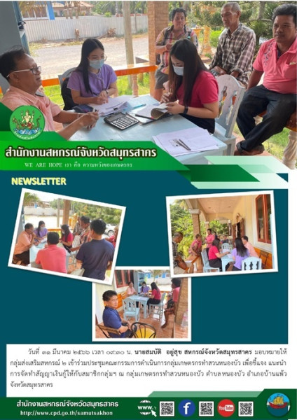 เมื่อวันที่ 31 มีนาคม 2566 เวลา 09:30 น. นายสมบัติ อยู่สุข สหกรณ์จังหวัดสมุทรสาคร มอบหมายให้กลุ่มส่งเสริมสหกรณ์ 2 เข้าร่วมประชุมคณะกรรมการดำเนินการกลุ่มเกษตรกรทำสวนหนองบัว เพื่อชี้แจง แนะนำ การจัดทำสัญญาเงินกู้ให้กับสมาชิกกลุ่มฯ ณ กลุ่มเกษตรกรทำสวนหนองบัว ตำบลหนองบัว อำเภอบ้านแพ้ว จังหวัดสมุทรสาคร