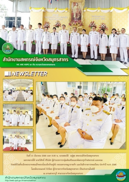 เมื่อวันที่ 31 มีนาคม 2566 เวลา 9.00 น. นายสมบัติ อยู่สุข สหกรณ์จังหวัดสมุทรสาคร มอบหมายให้ นายวิสิทธิ์ ศิริเลิศ ผู้อำนวยการกลุ่มส่งเสริมและพัฒนาธุรกิจสหกรณ์ และคณะ ร่วมพิธีวันที่ระลึกพระบาทสมเด็จพระนั่งเกล้าเจ้าอยู่หัว พระมหาเจษฎาราชเจ้า และวันข้าราชการพลเรือน ประจำปี พ.ศ. 2566 โดยมีนายณรงค์ รักร้อย ผู้ว่าราชการจังหวัดสมุทรสาคร เป็นประธานในพิธี ณ ลานสาครบุรี ศาลากลางจังหวัดสมุทรสาคร