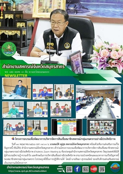 เมื่อวันที่ 10 พฤษภาคม 2566 นายสมบัติ อยู่สุข สหกรณ์จังหวัดสมุทรสาคร พร้อมด้วยทีมงานส่งเสริมการแก้ไขปัญหาหนี้ (ทีมโค้ช) สำนักงานสหกรณ์จังหวัดสมุทรสาคร เข้าร่วมโครงการอบรมเพื่อพัฒนาการบริหารจัดการสินเชื่อสมาชิกสหกรณ์/กลุ่มเกษตรกรอย่างมีประสิทธิภาพ ผ่านระบบ Zoom Meeting ณ ห้องประชุมสำนักงานสหกรณ์จังหวัดสมุทรสาคร วัตถุประสงค์เพื่อให้ผู้เข้าอบรมมีความรู้ ความเข้าใจ และทักษะในการบริหารสินเชื่ออย่างมีประสิทธิภาพ สามารถนำเทคนิคและแนวทางการแก้ไขปัญหาหนี้ของสมาชิกสหกรณ์/กลุ่มเกษตรกร ไปประยุกต์ใช้ในการปฏิบัติงานได้ โดยมีนายอัชฌา สุวรรณนิตย์ รองอธิบดีกรมส่งเสริมสหกรณ์ เป็นประธานเปิดโครงการฯ